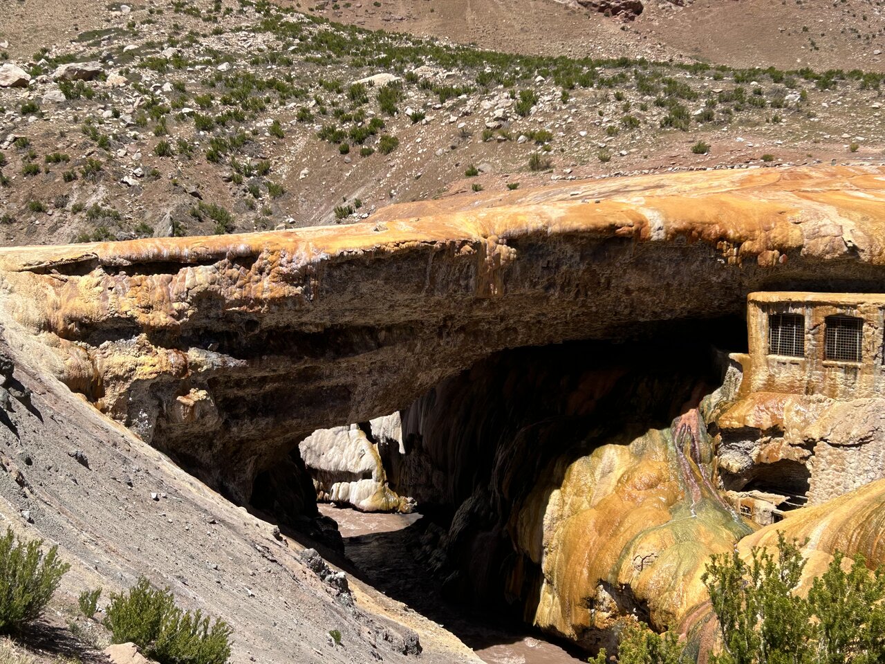 Next, you'll marvel at the natural arch of nearby Puente de Inca (Inca Bridge). Glaciers and hot springs around the Cordilleras formed this eye-catching landmark, which stretches over the Río Cuevas. It's a popular spot for bathing in thermal pools and the starting point for hikes in Aconcagua. Before returning to your Mendoza hotel, there might be time to take a dip in one of the steaming pools.