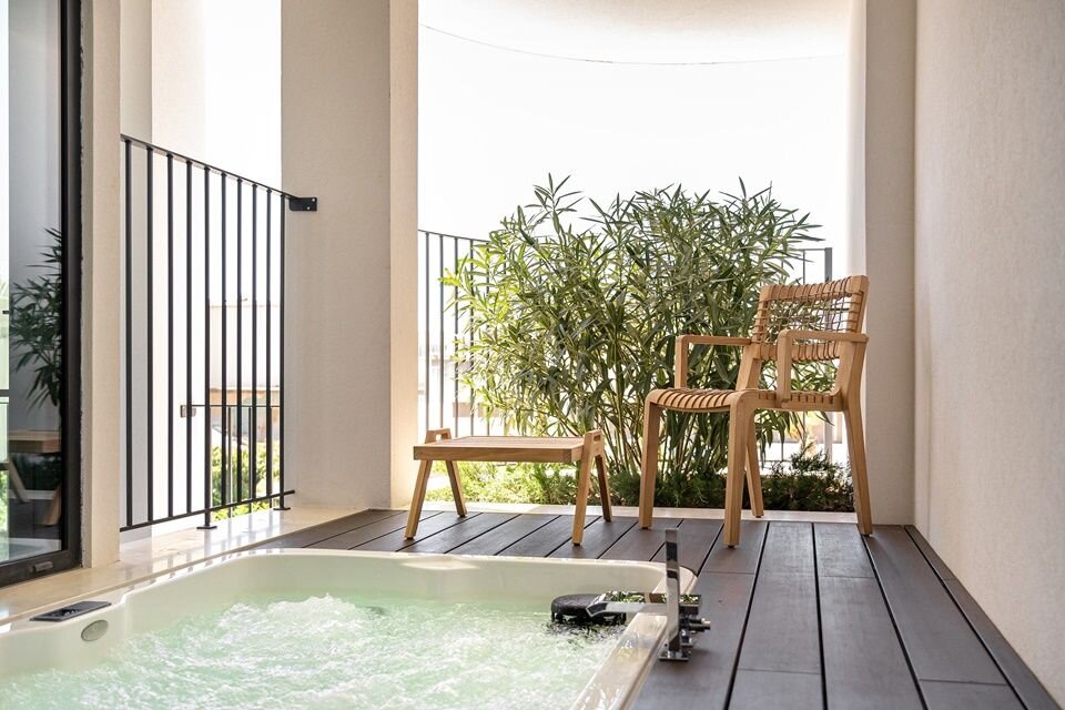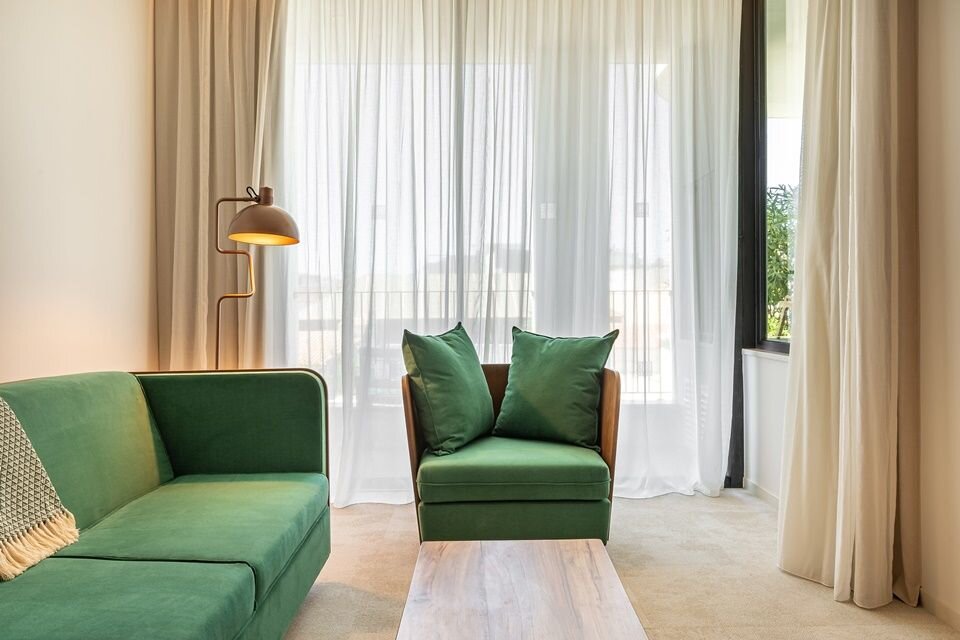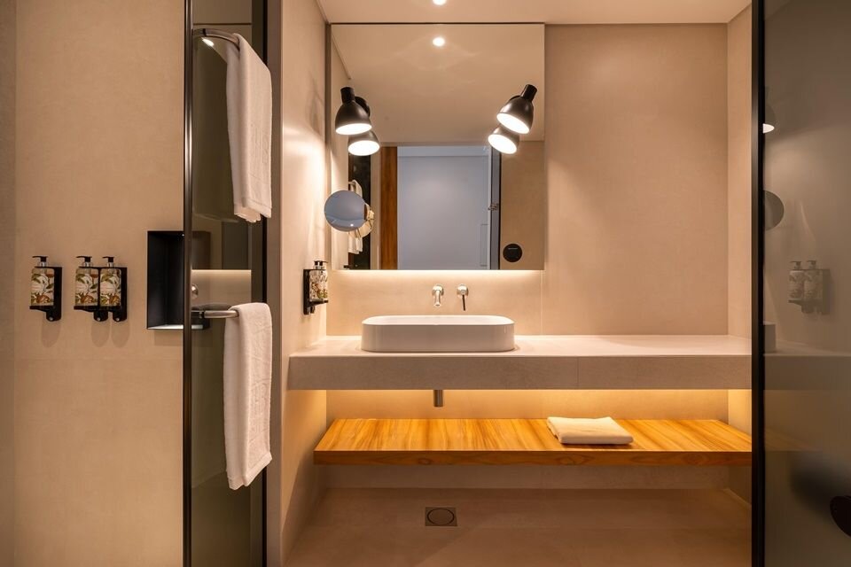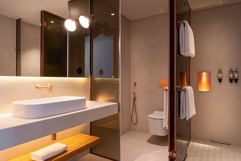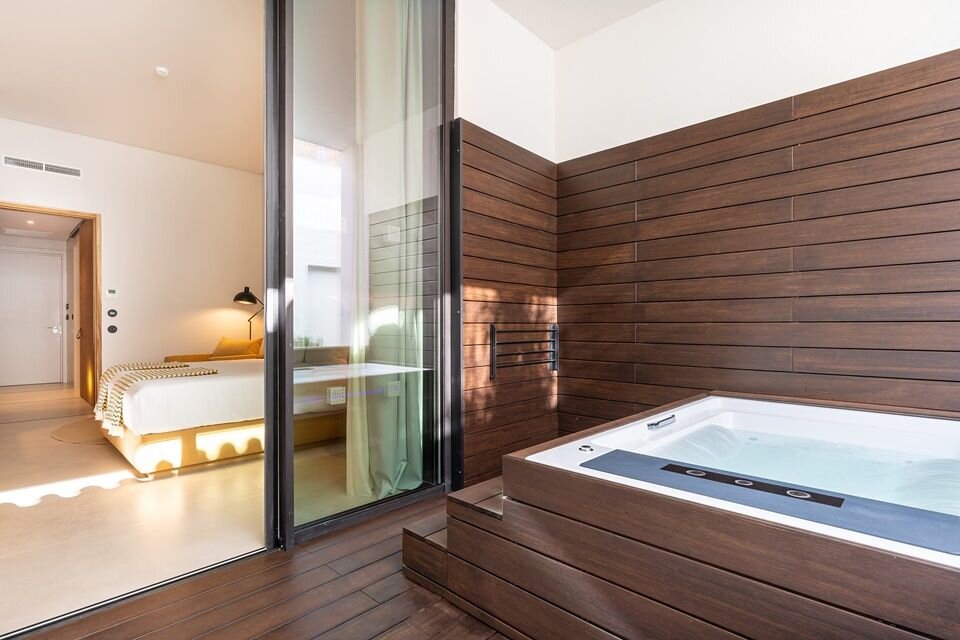 The 100+ rooms blend soft putty walls and Alentejo-crafted teak with plush headboards and armchairs in shades of kelly green and ocher. Each unit includes a furnished balcony and floor-to-ceiling windows, plus electric blackout curtains, Marshall speakers, and Nespresso machines. Standard units are surprisingly spacious, but you can upgrade to a Superior for more square footage, splurge on a Suite for a separate living room, or nab one of the Jacuzzi rooms for an outdoor hot tub. Bathrooms are no afterthought: expect copper accents, polished concrete surfaces, and glass walls that darken with the touch of a button.