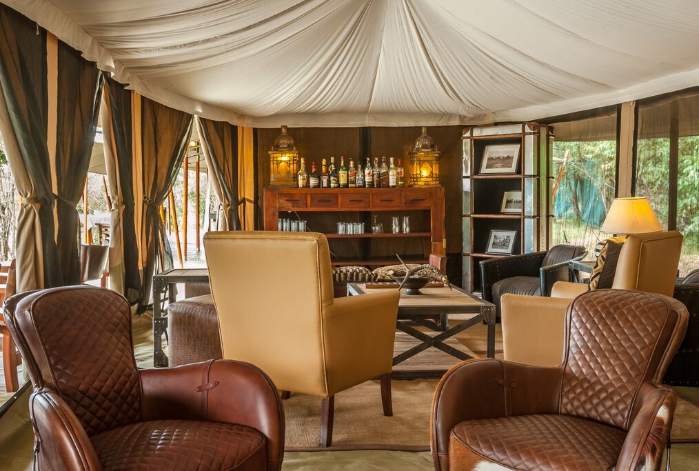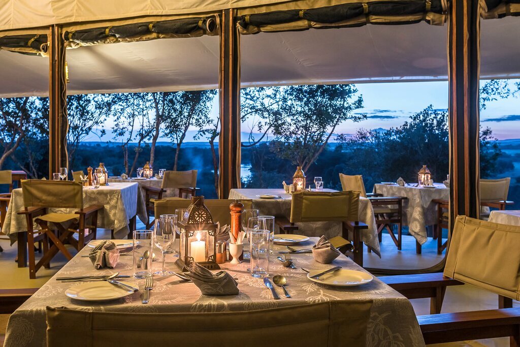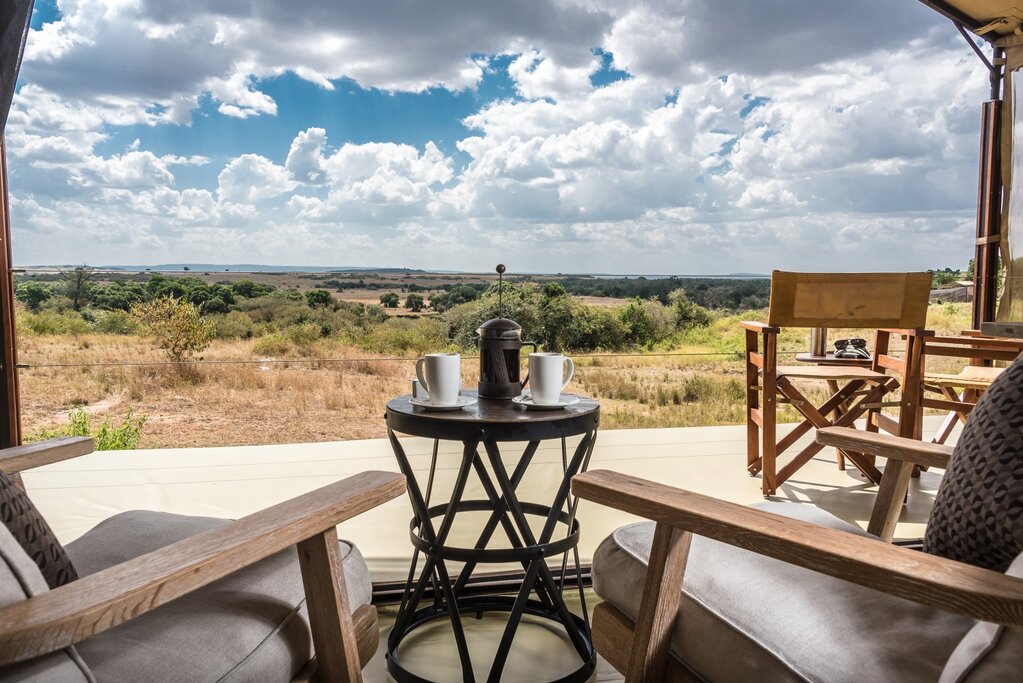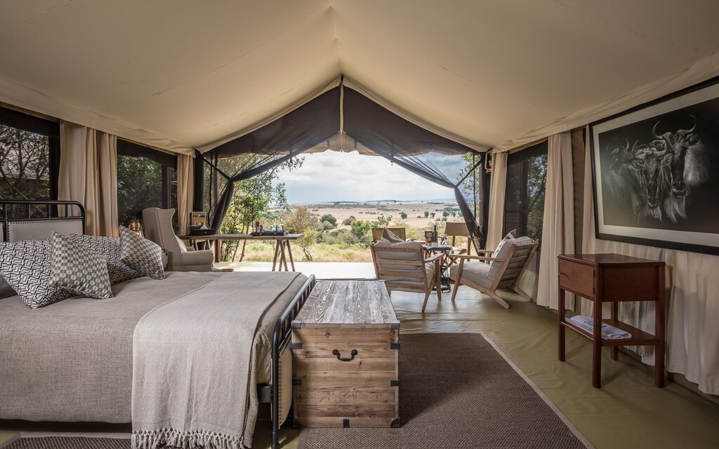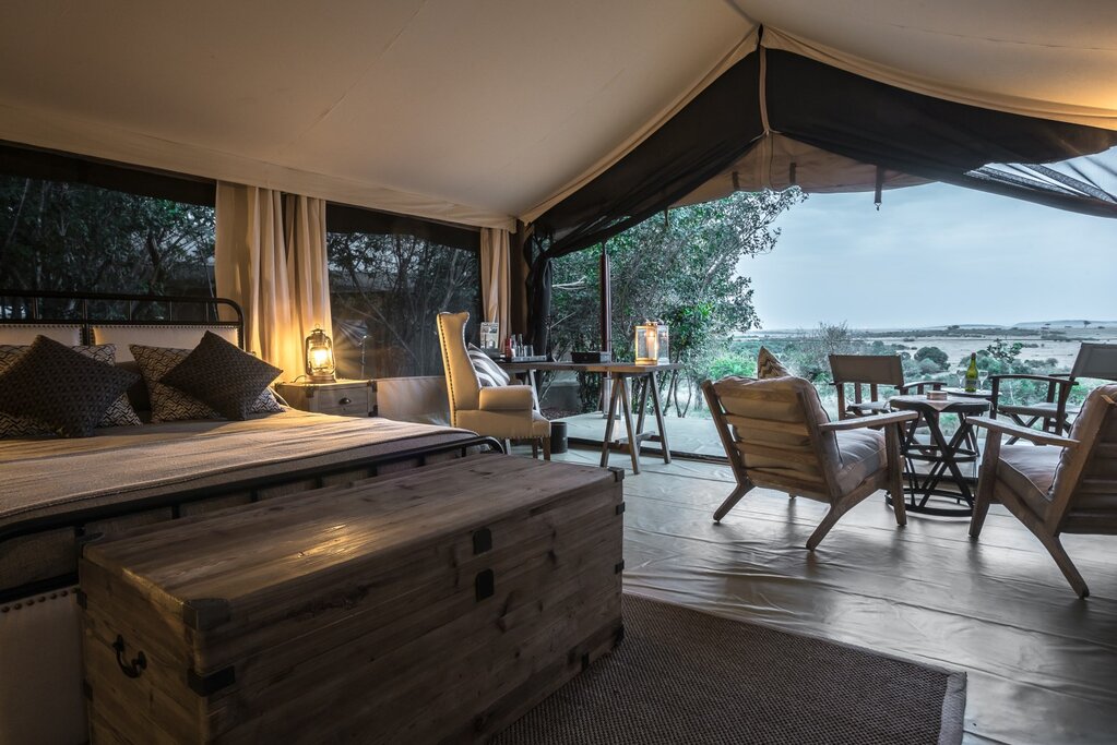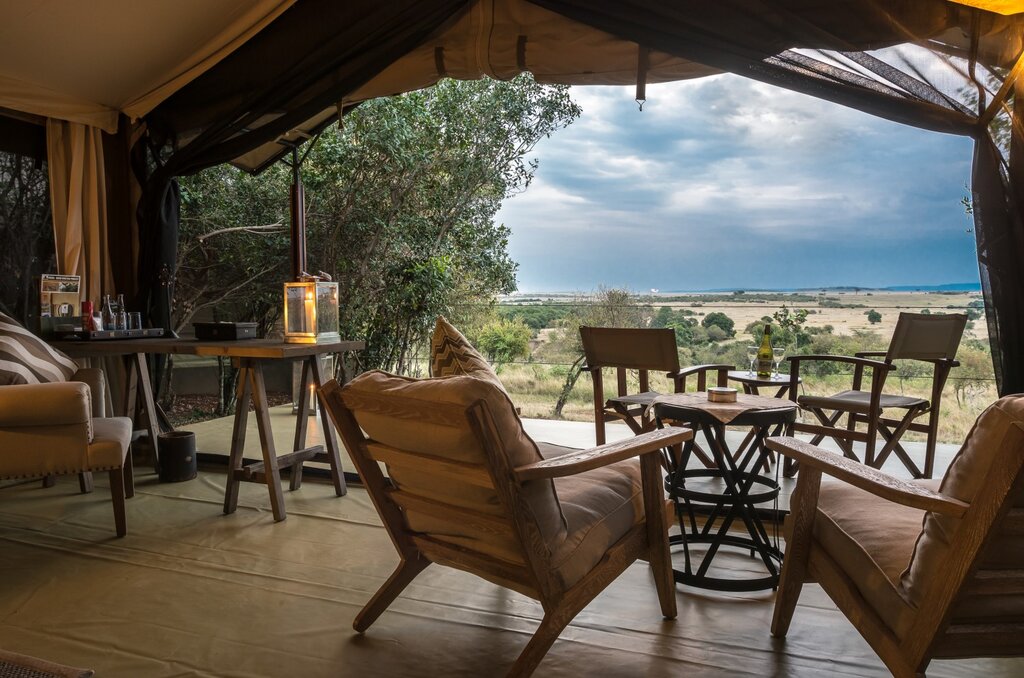 Luxury tented camp with spa and wildlife safaris, overlooking the plains and Mara River, near Great Migration crossing