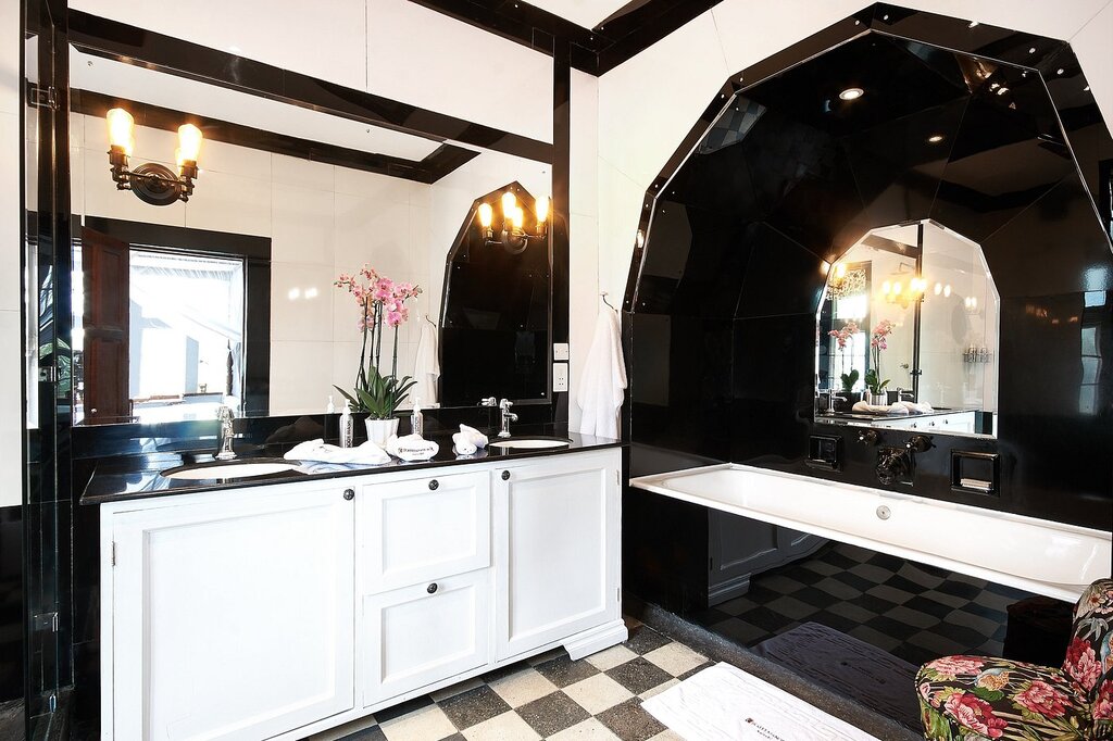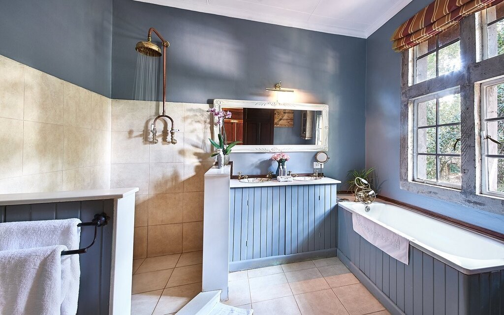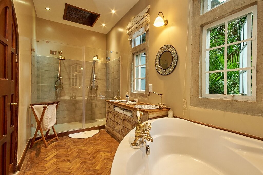 Twelve air-conditioned rooms are split between the original Giraffe Manor and the newer Garden Manor. Many feature period details like lead-paned French windows, herringbone parquet, carved fireplaces, vintage steamer trunks, and antique four-poster beds; some include private terraces and views toward the Ngong Hills. Superior units add deep soaking tubs and sitting areas with sleeper sofas, while suites offer two bedrooms with a separate living area. The spacious bathrooms have an Art Deco feel, with rain-style showers, robes, and locally made organic toiletries. All rooms have WiFi, but there are no TVs here.