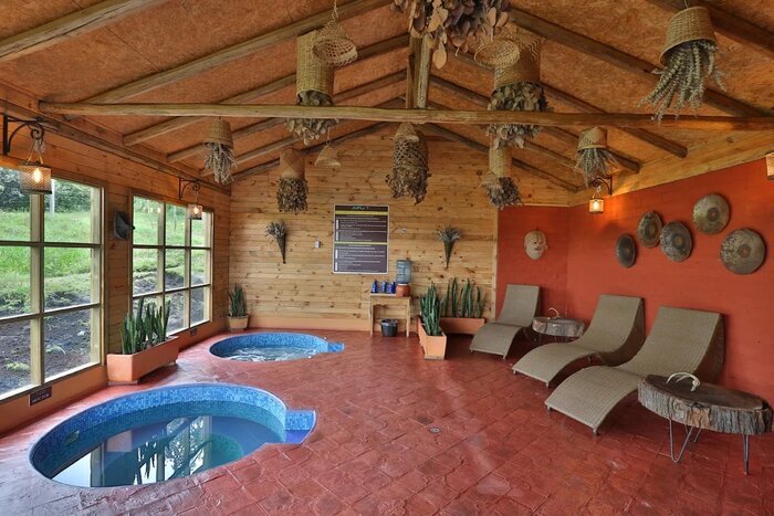 - The small spa includes hot tubs, cold pools, and a sweat lodge heated by volcanic rocks.