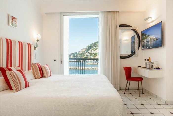 Each of the 34 air-conditioned rooms has a fresh, airy feel, with stark white walls, hand-painted Vietri tile floors, and coral and cobalt soft furnishings adding marine-inspired splashes of color. Beds are dressed with crisp, white Frette linens, and marble bathrooms are large and bright, with Frette robes and Carthusia toiletries (made in nearby Capri). Standard units are the simplest and smallest; upgrade to a Deluxe for more space, a large soaking tub, and a sea-facing balcony, or nab one of the Suites for dual aspect views, furnished terraces with Jacuzzis, or separate seating areas.