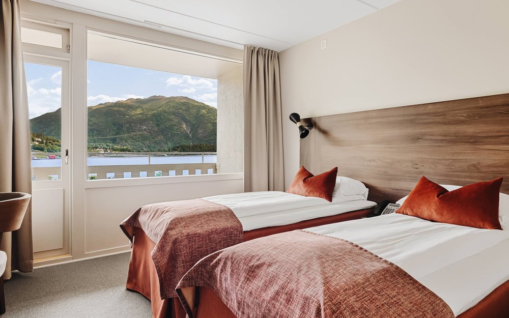 - Most rooms on either side of the hotel have balconies with fjord views.