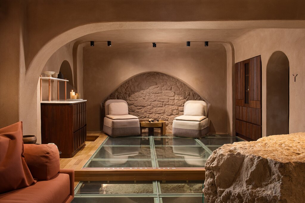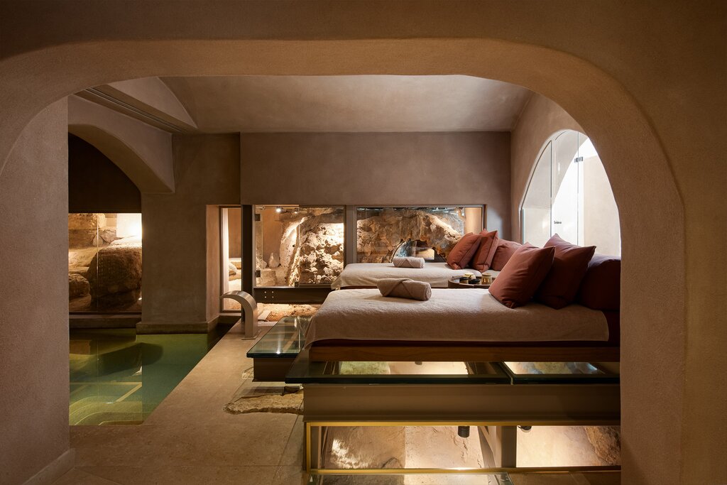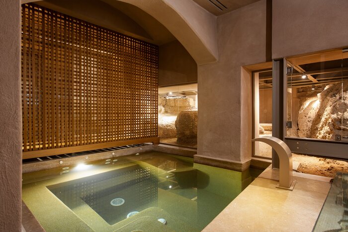 - The underground spa offers a heated pool, hammam, and treatment rooms built atop the remains of Roman ruins.