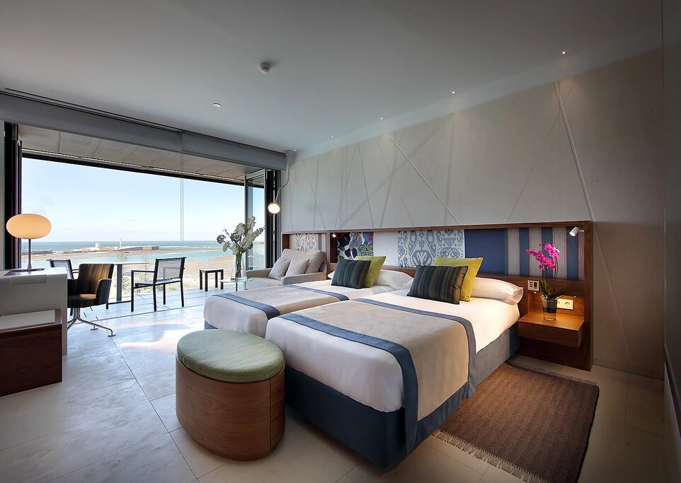 Most of the 124 rooms face the Bay of Cádiz, with floor-to-ceiling glass walls (complete with electric blackout blinds) that open onto private balconies. The decor is sleek and modern, with glossy tile floors, modular furniture, and pale shades of sea green and gray. Standard units are the most compact; upper-story Superiors offer the best views, while Junior Suites add a separate living area. Bathrooms make clever use of space, with frosted-glass walls, vessel sinks, and rain-style showers (some upgraded rooms include deep soaking tubs). There are also two accessible rooms for guests with limited mobility.Amenities