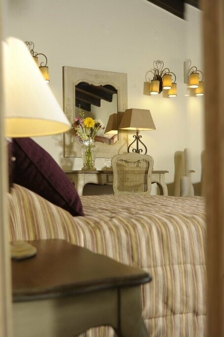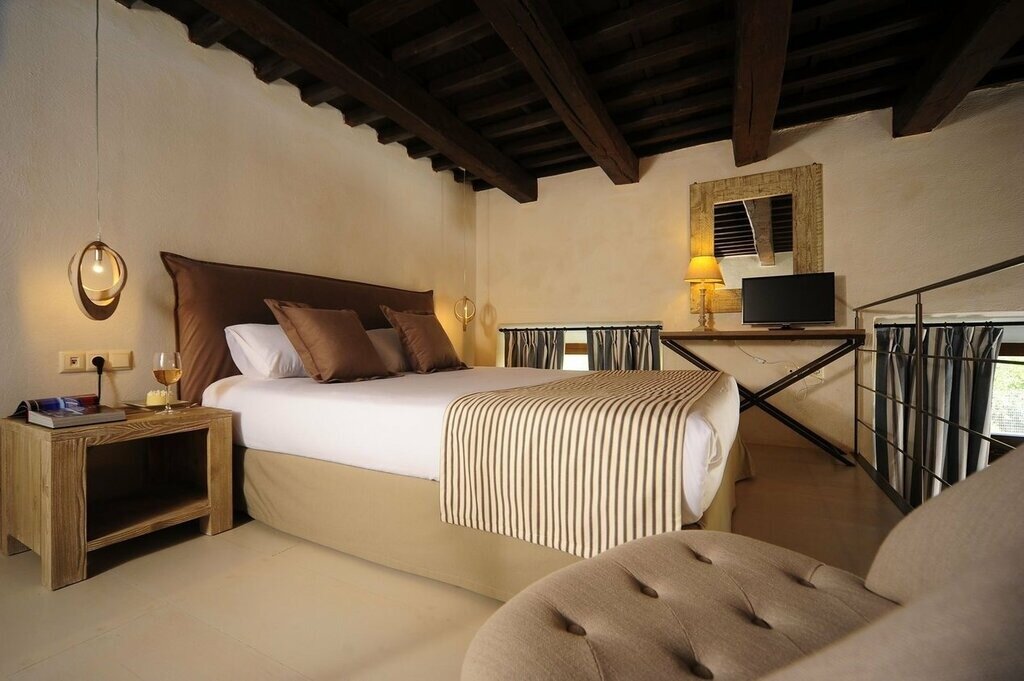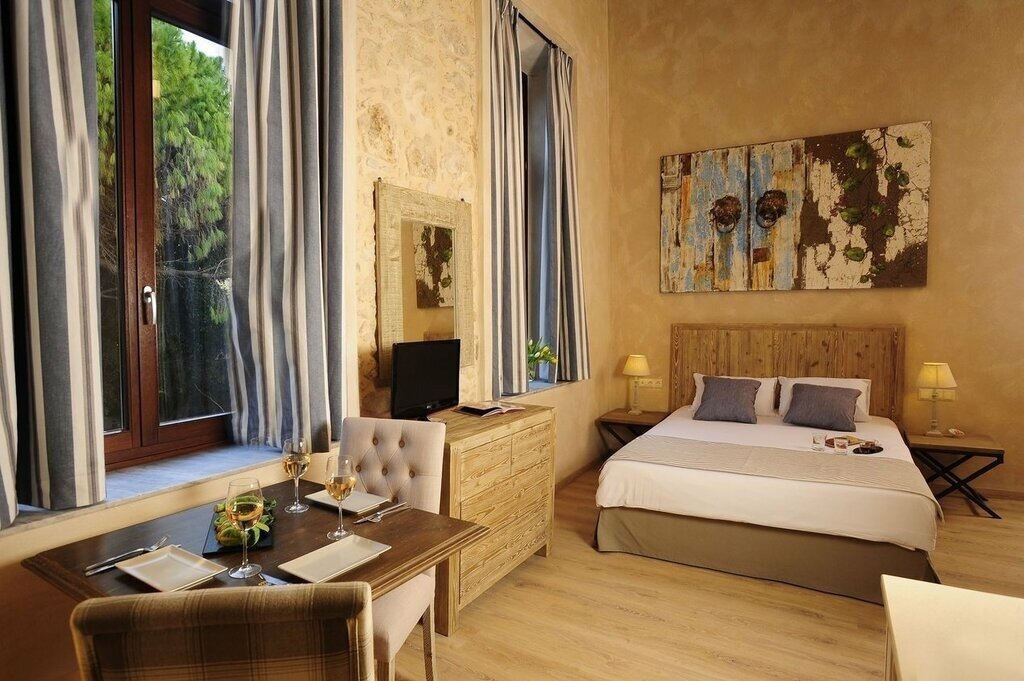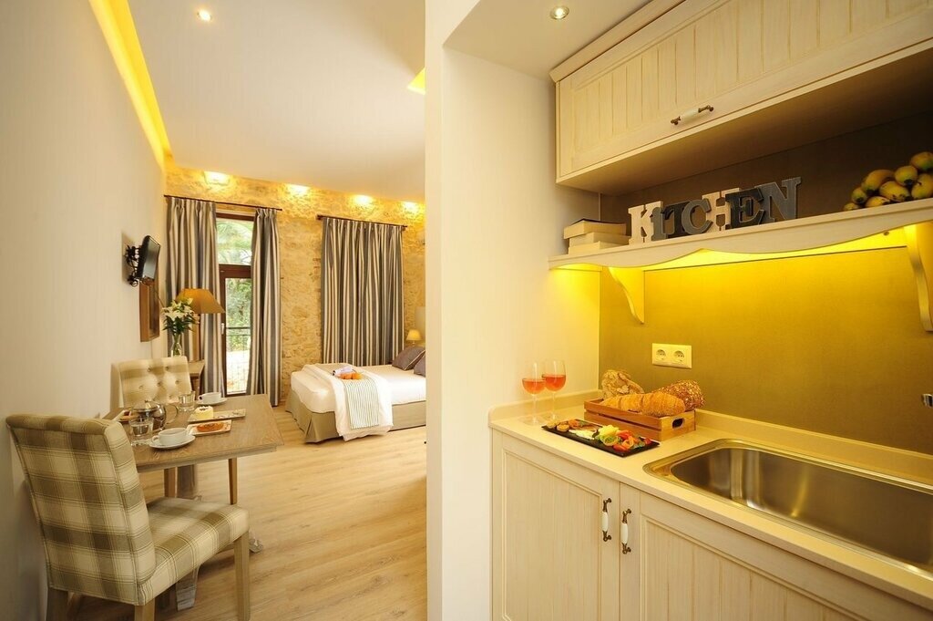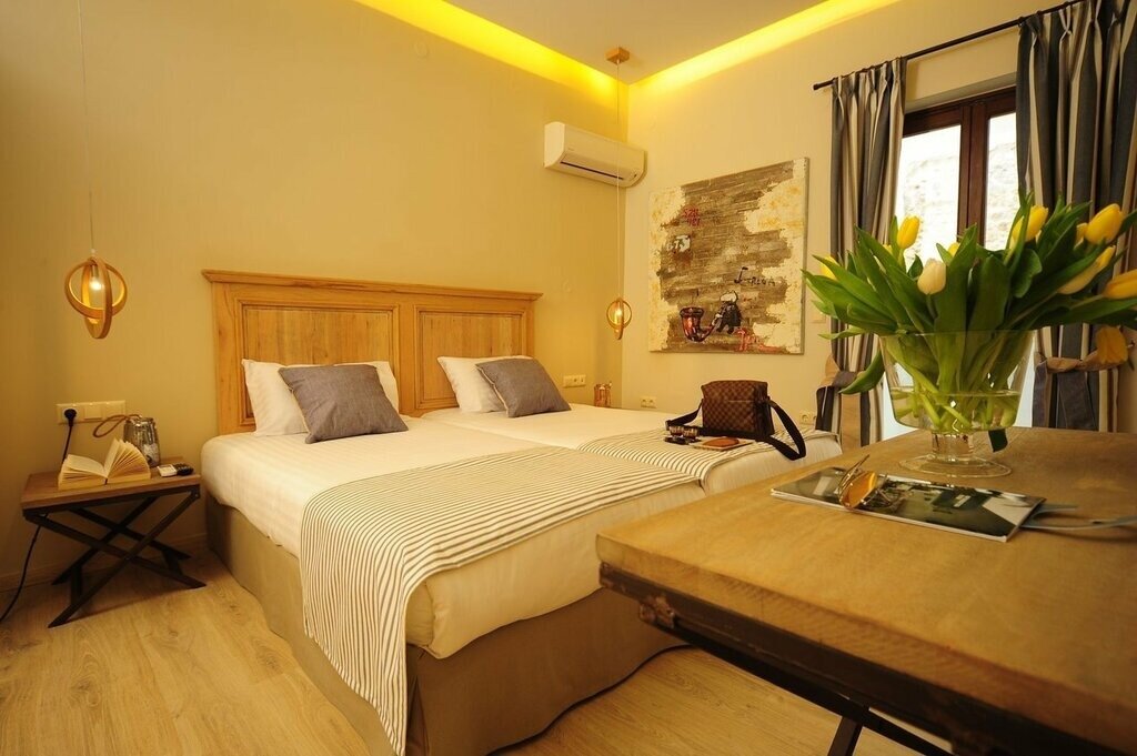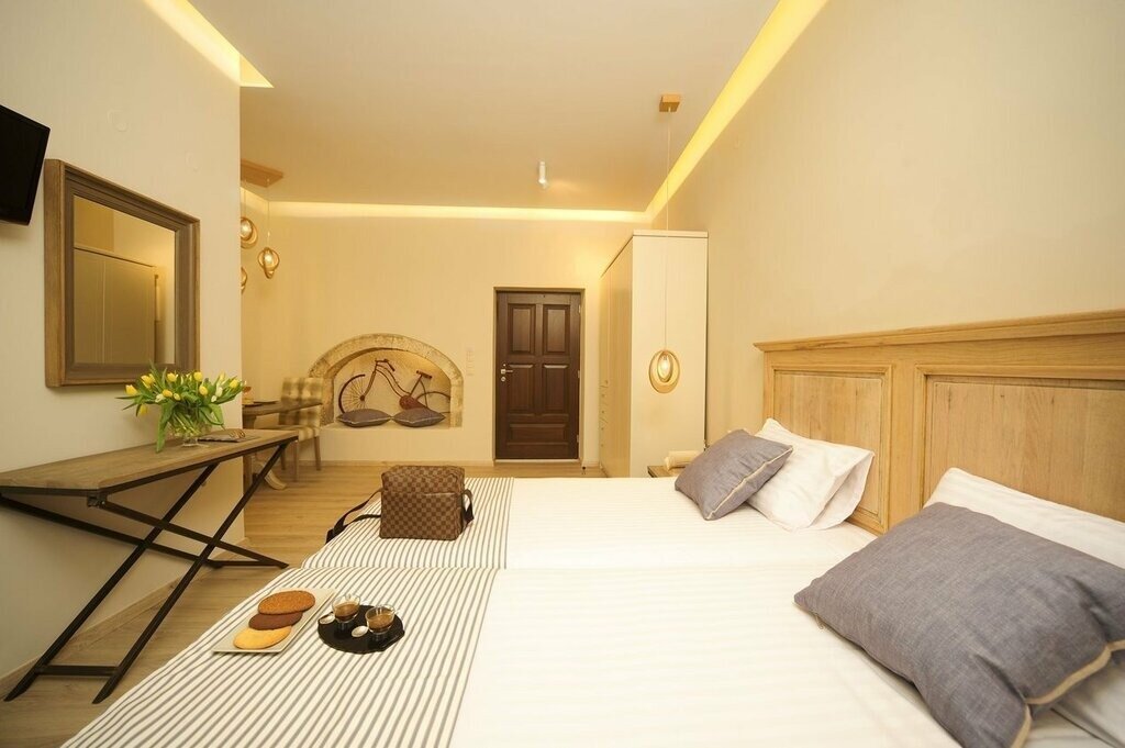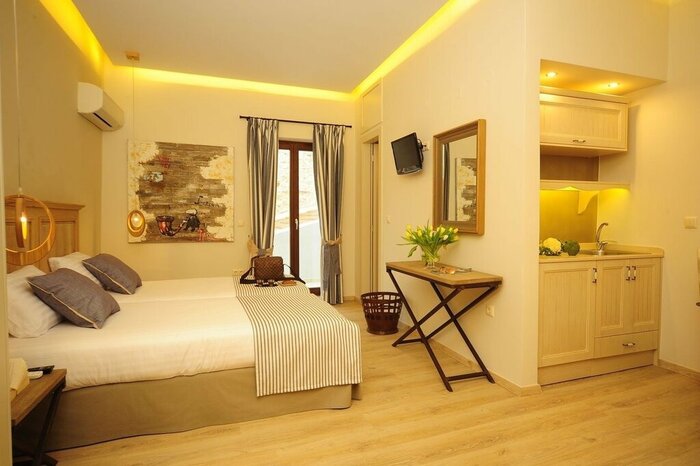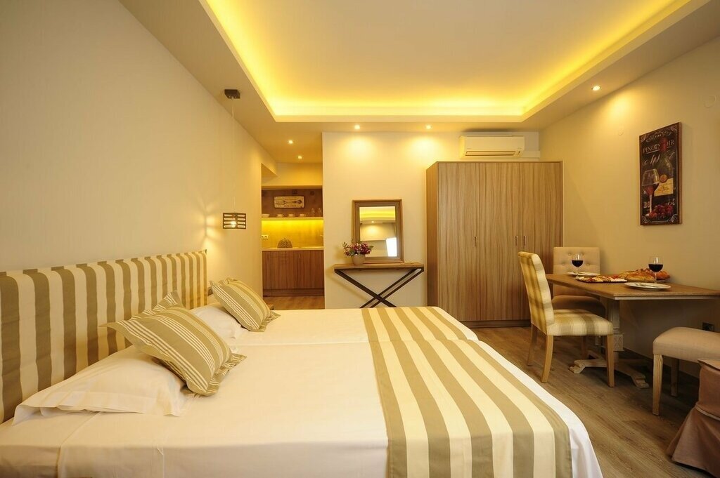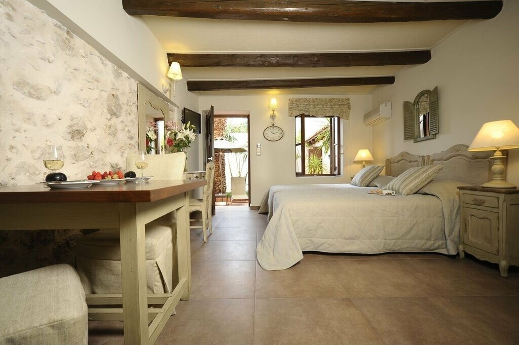 There are just 17 air-conditioned rooms here, all with a soft, neutral palette, characterful architectural features (including stone walls and exposed rafters), and modern comforts like espresso makers and pillowtop Candia mattresses. The ground-floor Standard and Maisonette units are the smallest (and simplest), with corner showers and views of the pool area and courtyard. Recently renovated Superiors are up a level, adding space and more luxurious bathrooms, while Suites offer a split-level stay with a loft-style bedroom, living area with sofa bed, and a small kitchenette.