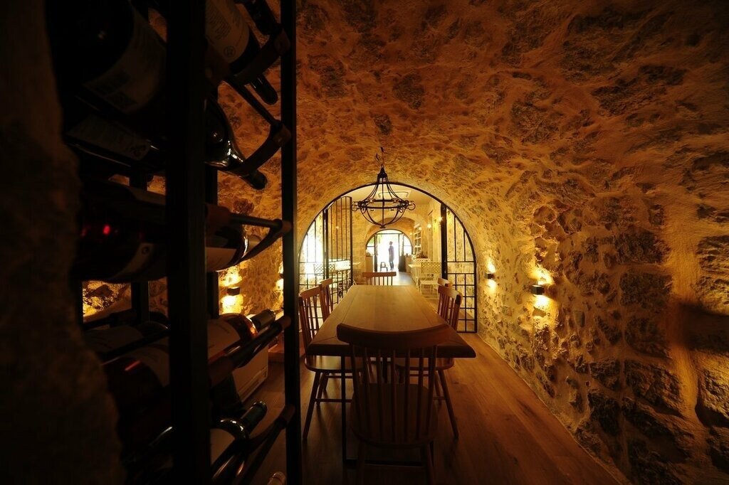 The hotel's sun-soaked courtyard is a delightful spot, with a petite plunge pool surrounded by tall stone walls and shaded by palms and fragrant citrus trees. You can enjoy the included breakfast here in warmer weather: an authentic Cretan spread that includes cheeses, yoghurts, eggs, breads, olives, and the island's famous thyme honey (vegan and other dietary options are available). Indoors, you'll find a small bar and an atmospheric stone wine cellar (complete with original arched ceilings), where you can book wine tasting experiences with advanced notice.