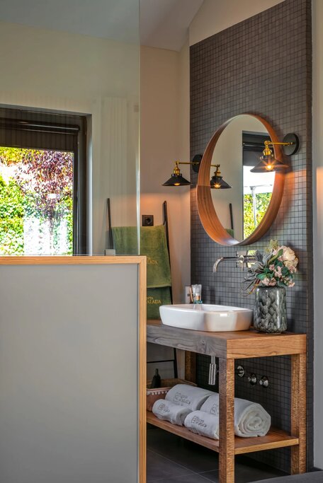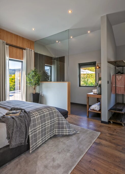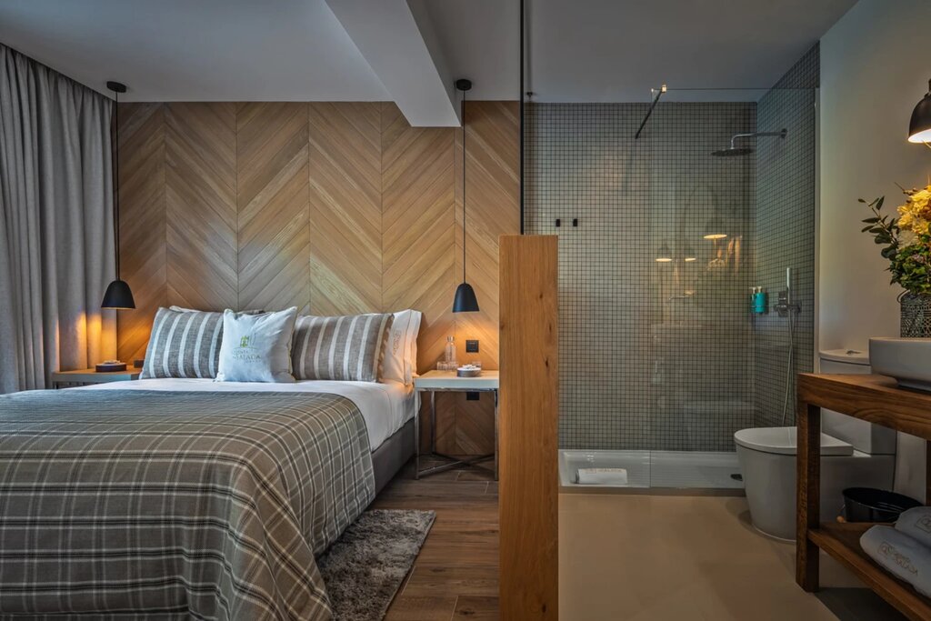 The converted caretaker's house is split into six air-conditioned rooms, all decorated in an airy, contemporary style with blonde woods, pendant lamps, woven baskets, and hand-carved furniture (the cork accent pieces and potted olive trees add a nice regional touch). Each room features glass doors that open out onto the cobbled courtyard and pool area, and all are situated to maximize the Douro Valley views. Standard units are quite compact; it's worth upgrading to a Superior for a little more space to spread out. Bathrooms are sleek and stylish, but the open-plan design offers little privacy, with half-wall partitions separating the glass-walled, rain-style showers.