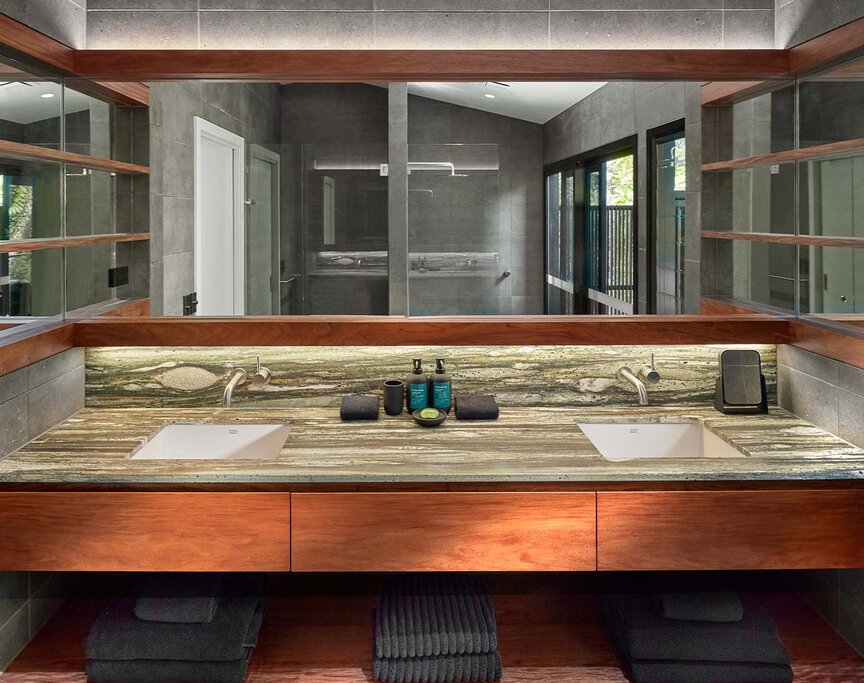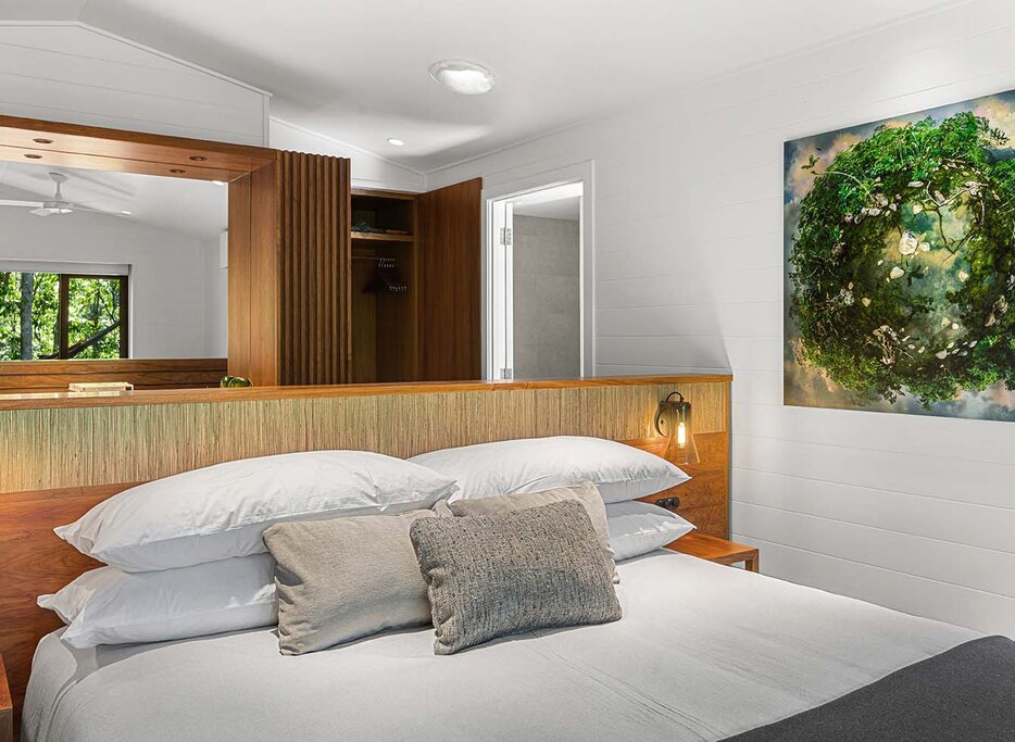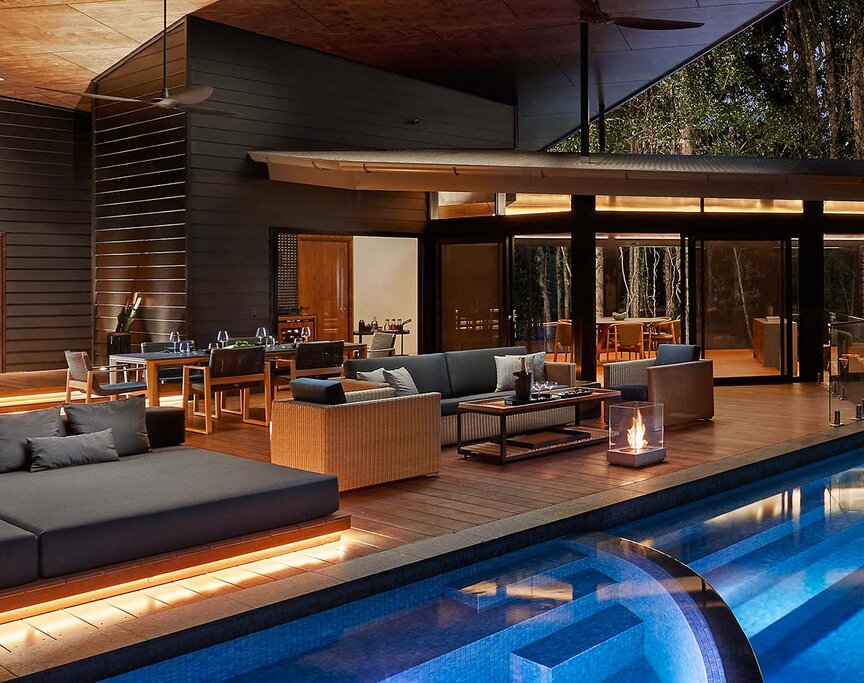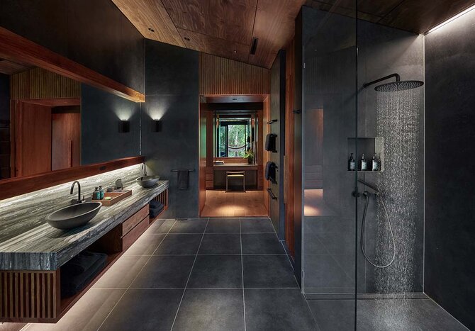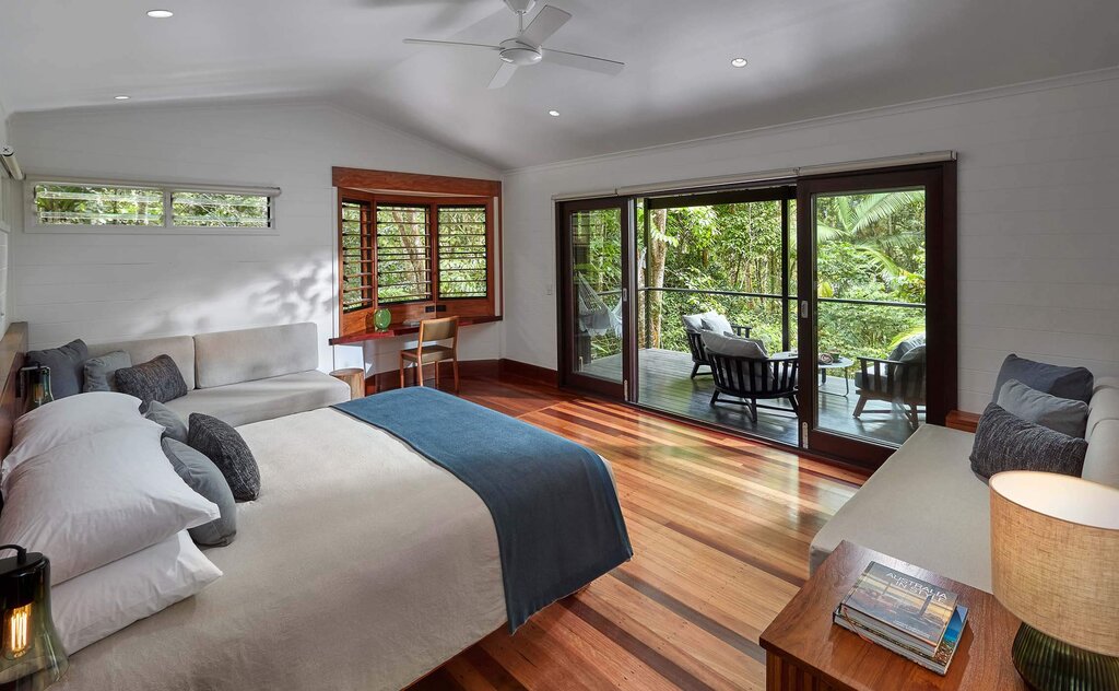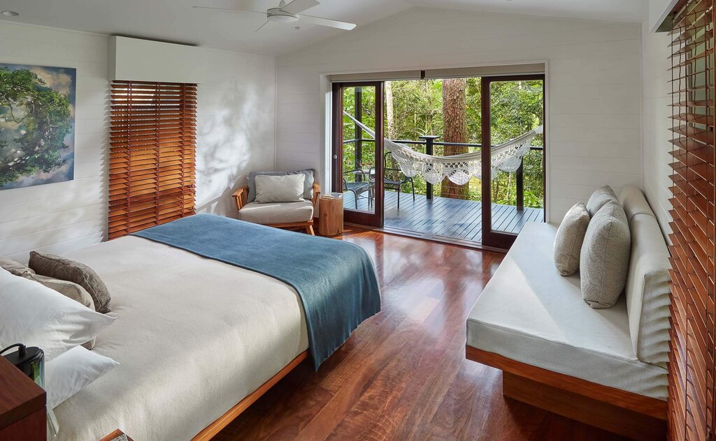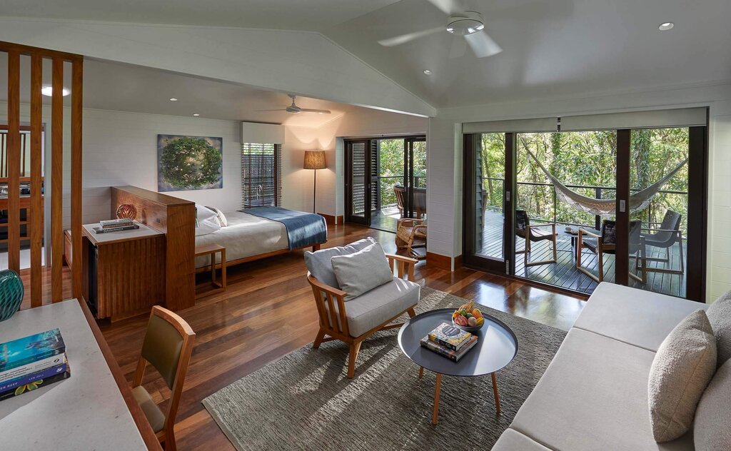 Forty timber-clad suites are compact yet thoughtfully designed, with expansive decks that place guests directly in the treetops. Hammocks, curated book collections, and minimalist interiors ensure the rainforest remains the star of the show. Many rooms feature outdoor stone soaking tubs angled toward the canopy, while the Billabong Suites add fireplaces for cooler evenings. Bathrooms are spa-like, stocked with the lodge's own botanical "healing waters" products. Upgrade to the Daintree Pavilion for two separate bedroom wings, an outdoor atrium with a tiered pool, and wrap-around rainforest views.