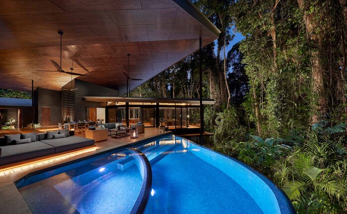 Eco-friendly rainforest lodge with treehouse-style suites, Aboriginal culture experience, spa, pool, and inspired fine dining