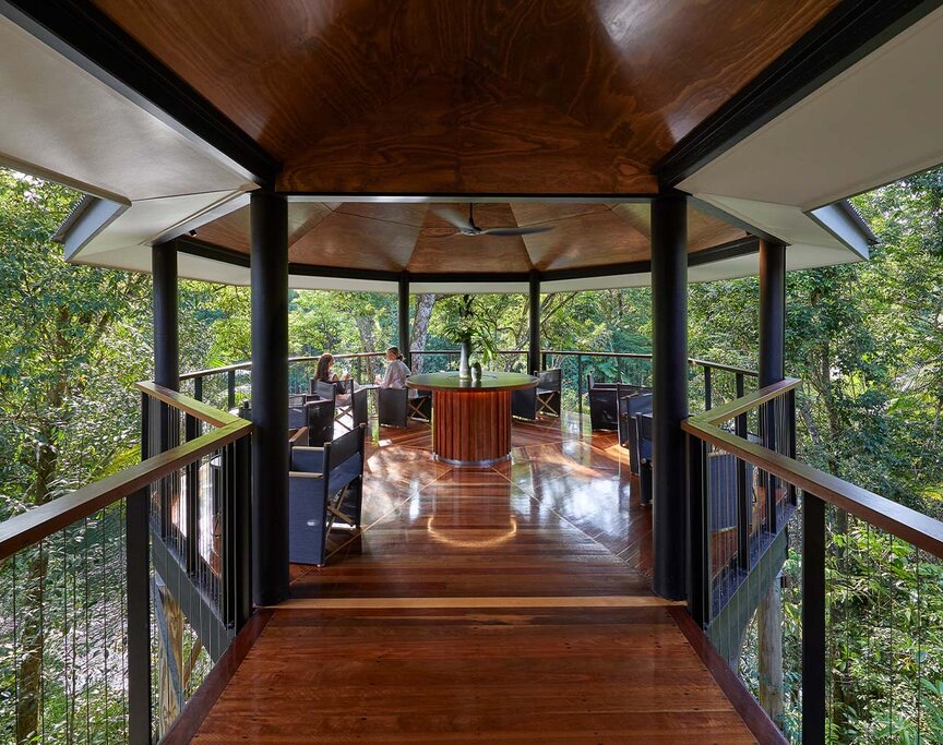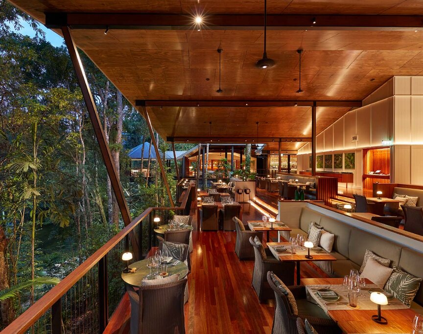 Guests can join daily yoga classes, unwind in the lagoon-style rock pool, sip sunset drinks at the Jungle Perch bar overlooking Mossman River, or book time at the Healing Waters Spa, inspired by Aboriginal beliefs around water as a life-giving force. Dining is a highlight, with the Treehouse Restaurant set high in the canopy, featuring a plant-to-plate philosophy and an Asian-influenced menu that spotlights regional produce and tropical flavors. A fully equipped gym, riverside lounges, and garden spaces round out the stay, and kayaking and swimming in the (croc-free) Mossman River are bonuses, as is relaxing on the octagonal river-view deck. Electric bikes are available, making it easy to explore Mossman Gorge and nearby trails.