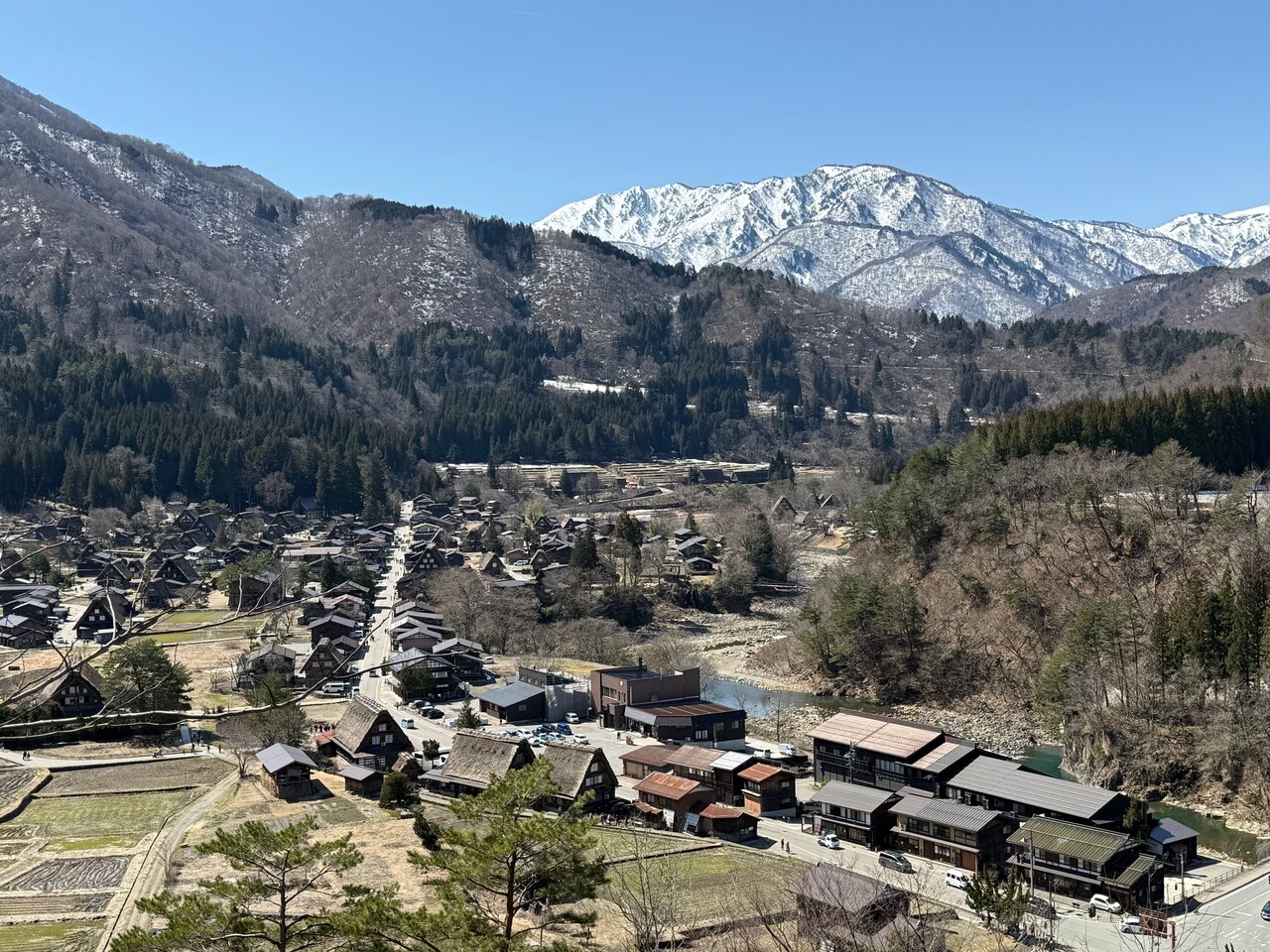 Drive from Kanazawa with alpine scenery, high snow capped mountains, tunnels, thatched roof houses