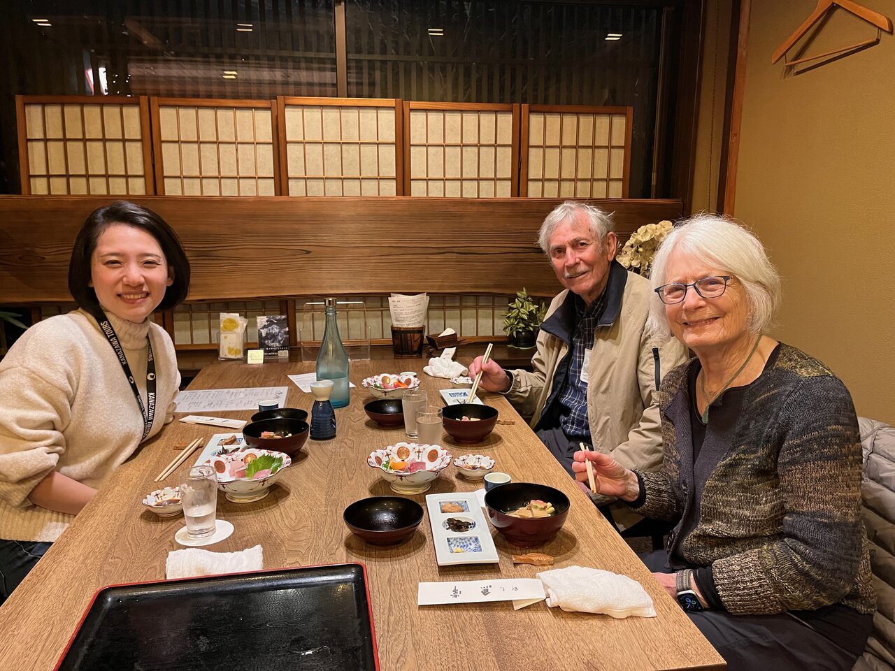 In Kanazawa we had a private prepared traditional Japanese dinner and night tour with a fantastic guide whose name we forgot to write down. She went into depth about the differences between shrines and temples, and the history of geisha districts which we walked through. The dinner was superb. We also took a day trip to Shirakawago in private car. The drive through the mountains gave us another perspective of Japanese scenery and living. We walked through the town of thatched roof houses and learned the history and why it's now a UNESCO Heritage site.