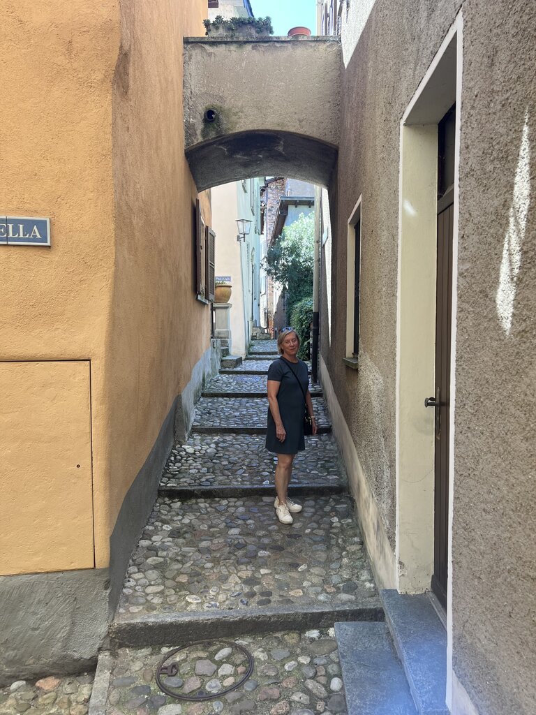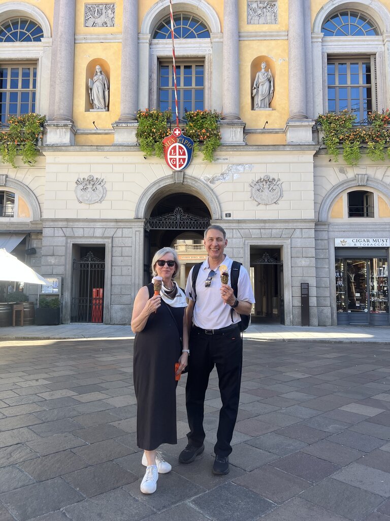 Patricia arranged a beautiful lunch at a little place right along the lake. She helped us order traditional Swiss food and wine. Our conversation included discussing a love of family, origins, food, history, geography, and traditions. She guided us to a place to buy a little Ticino book I mentioned I was interested in acquiring. She also presented us with a little Ticino anniversary gift - two small baccolino cups. She recommended we try nocino over gelato. She worked to take some beautiful photos of us. She suggested we take the boat ride back to Lugano instead of the planned reverse bus & train. It was a lovely ride and great suggestion.